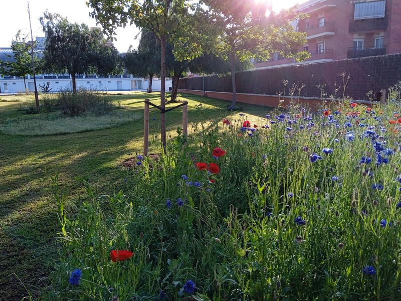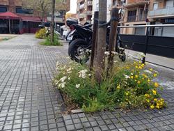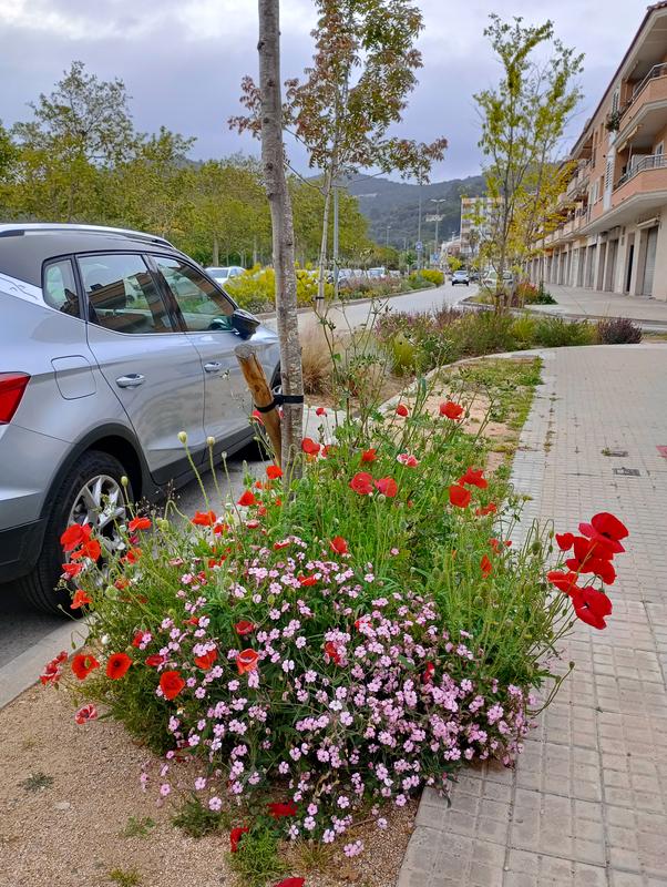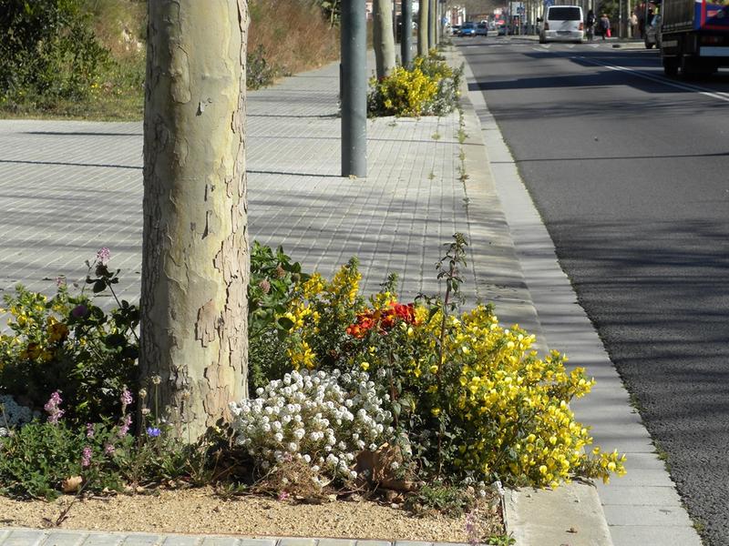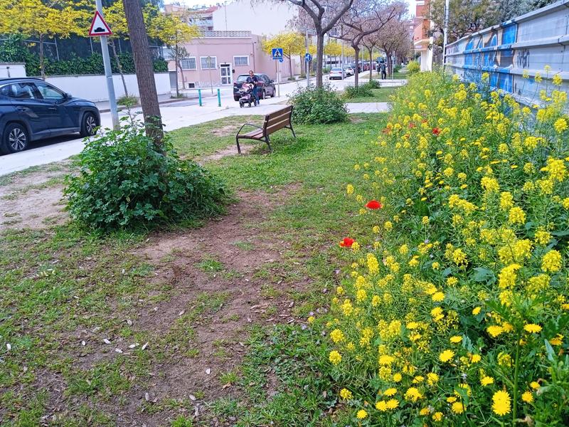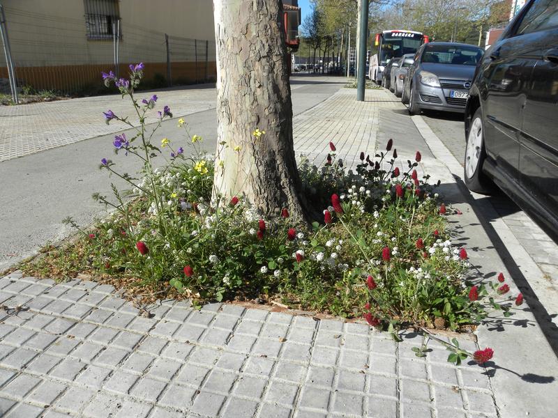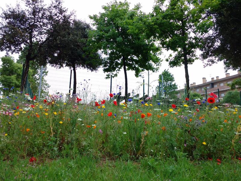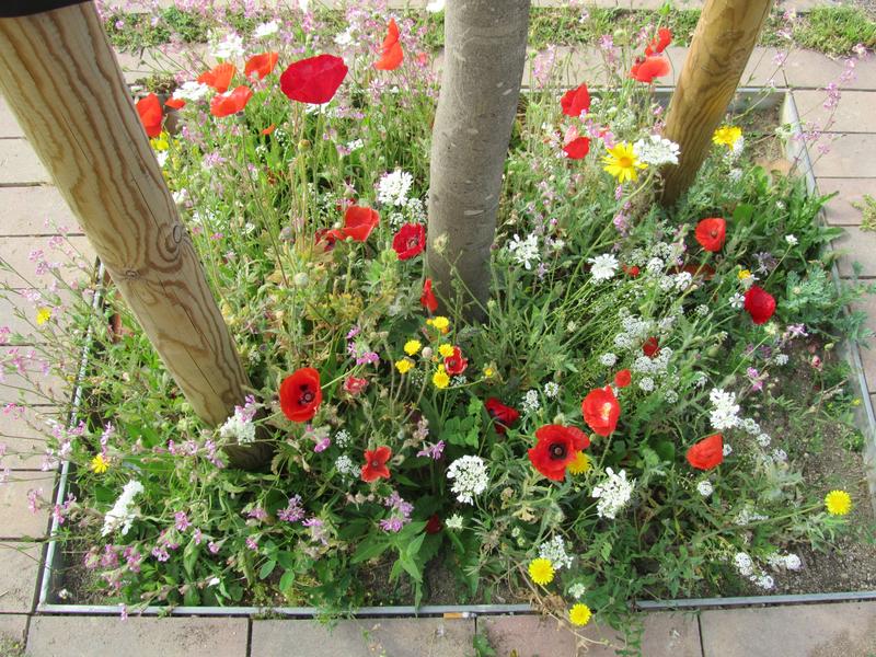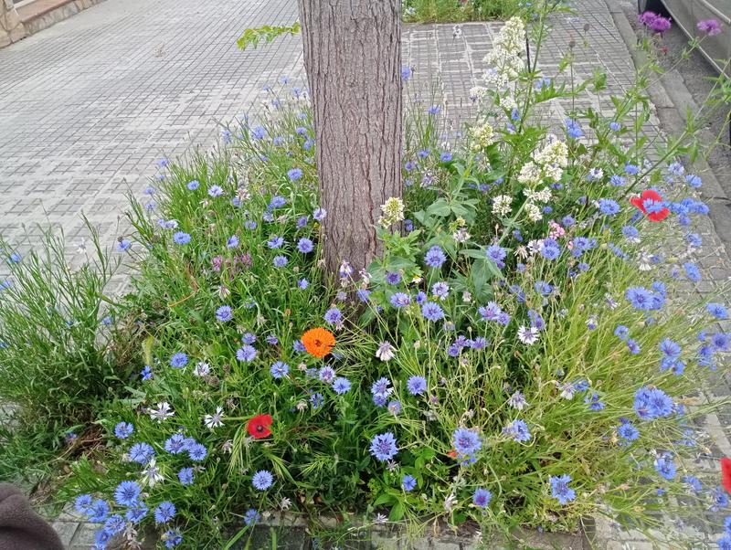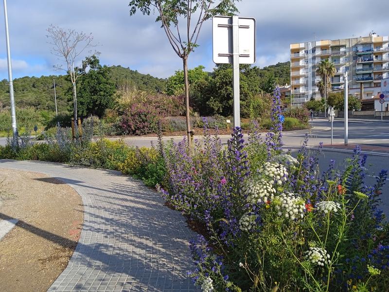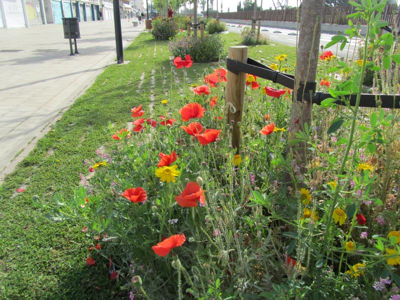 Peus d'arbres i franja sembrades amb plantes silvestres i vivaces