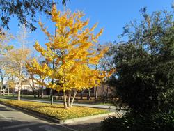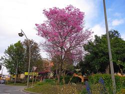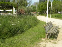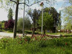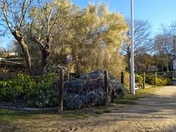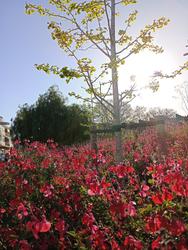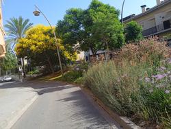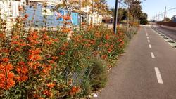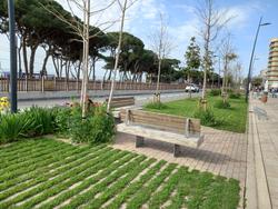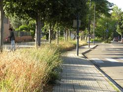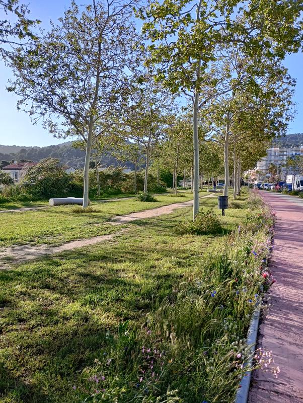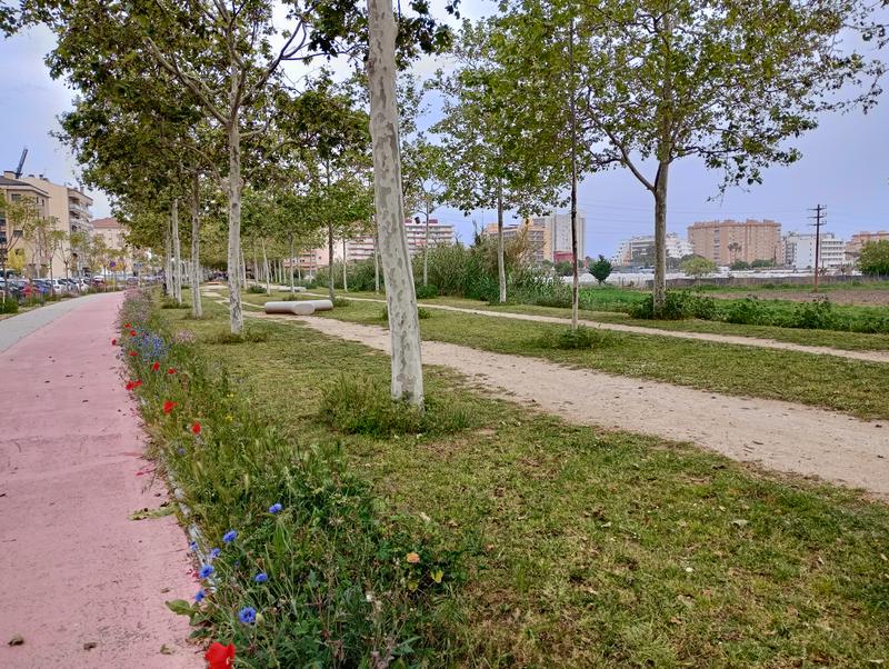 Franja i peus d'arbres sembrats amb plantes silvestres i vivaces